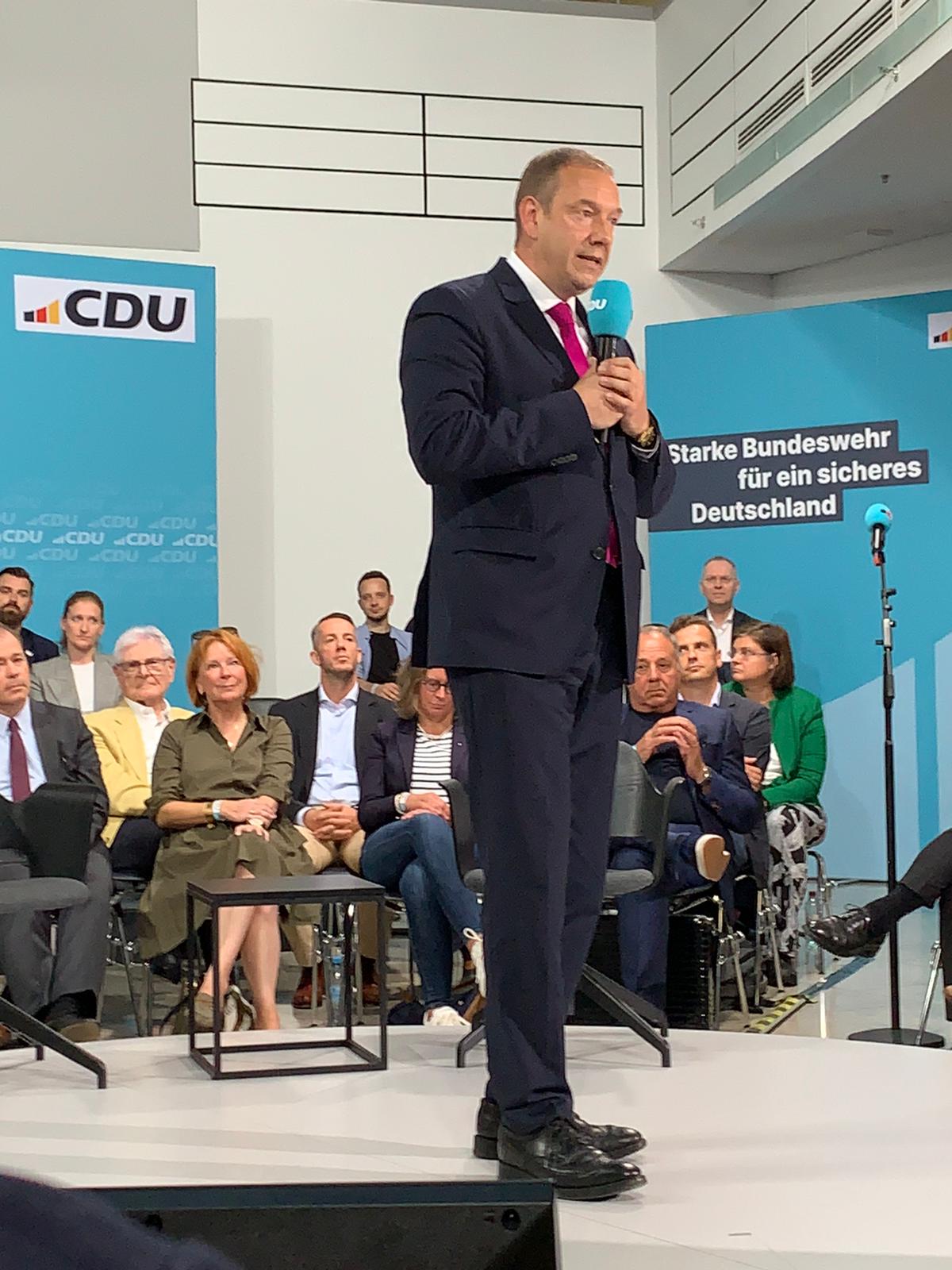 Wo steht Deutschland ein Jahr nach der Zeitenwende? Wo steht die Bundeswehr in unserer Gesellschaft? Darüber sprachen die Teilnehmer in den hochkarätig besetzten Panels zu Beginn der Veranstaltung. Theo Beckers sprach dabei die Herausforderungen im Bereich Personal, Finanzen und Struktur an. "Das Eckpunktepapier wurde damals auf Eis gelegt. Wie können wir als CDU dafür sorgen, dass die sinnvollen Punkte des Eckpunktepapiers umgesetzt werden?" fragte er die Teilnehmer und lenkte damit die Aufmerksamkeit auf eine dringend notwendige Strukturreform der Bundeswehr, die weiterhin ausbleibt. Auch die Rolle der Reserve und eine Stärkung eben dieser wurde durch die Anwesenden angemahnt. Neben offensichtlichen Defiziten bei der Bundeswehr wie materieller Ausstattung wurde so sehr deutlich, dass es mit der Anschaffung von neuen Panzern und Kampfjets nicht getan sein wird.